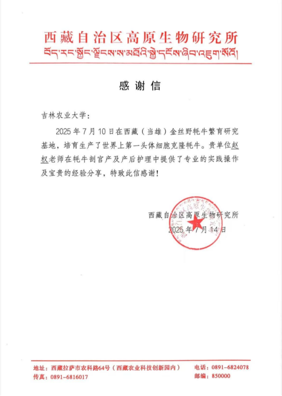 阅读量: 1273近日,西藏自治区高原生物研究所发来感谢信,对动物科学技术学院、动物医学院赵权教授在担任体细胞克隆牦牛接生技术主要负责人期间,为全球首例体细胞克隆牦牛所做出的贡献表示肯定,对其专业素养和协作精神给予高度认可。